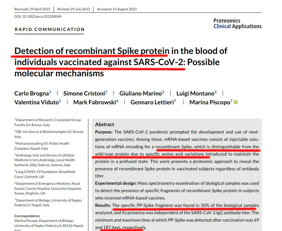 Een nieuwe wetenschappelijke studie door het Italiaanse wetenschapsteam Brogna et al., ontdekte de aanwezigheid van spike-eiwit in COVID-gevaccineerde mensen zes maanden na vaccinatie – en sloot de mogelijkheid uit van kruisbesmetting van experimentele gegevens met in het wild circulerende COVID-infecties.