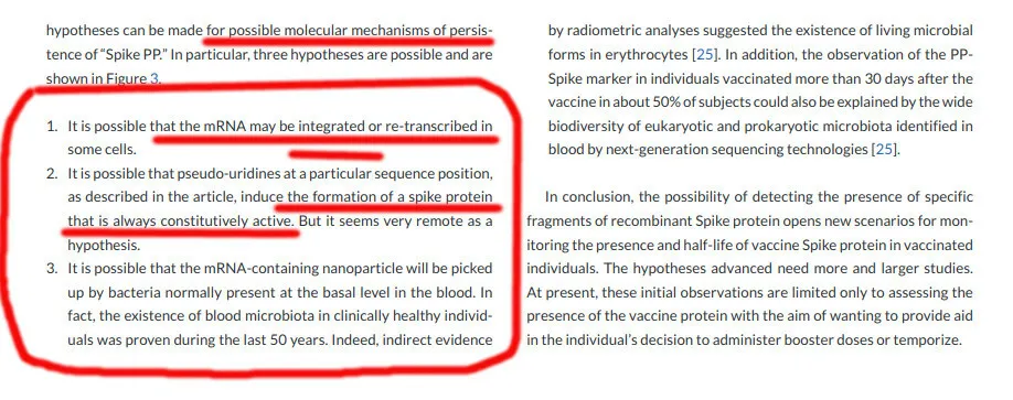 Opmerkelijk is de bovenstaande zin: “Het is mogelijk dat het mRNA in sommige cellen geïntegreerd of opnieuw getranscribeerd wordt”. De zogenaamde omgekeerde transcriptie, dat wil zeggen dat het mRNA van het vaccin deel wordt van het menselijke DNA-genoom in sommige aangetaste cellen, werd oorspronkelijk zonder bewijs verworpen door de zogenaamde “COVID-wetenschap”, totdat het werd aangetoond in in-vitro-experimenten: